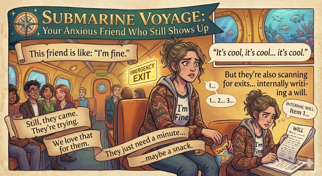 But they’re also scanning for exits, counting breaths, and internally writing a will.