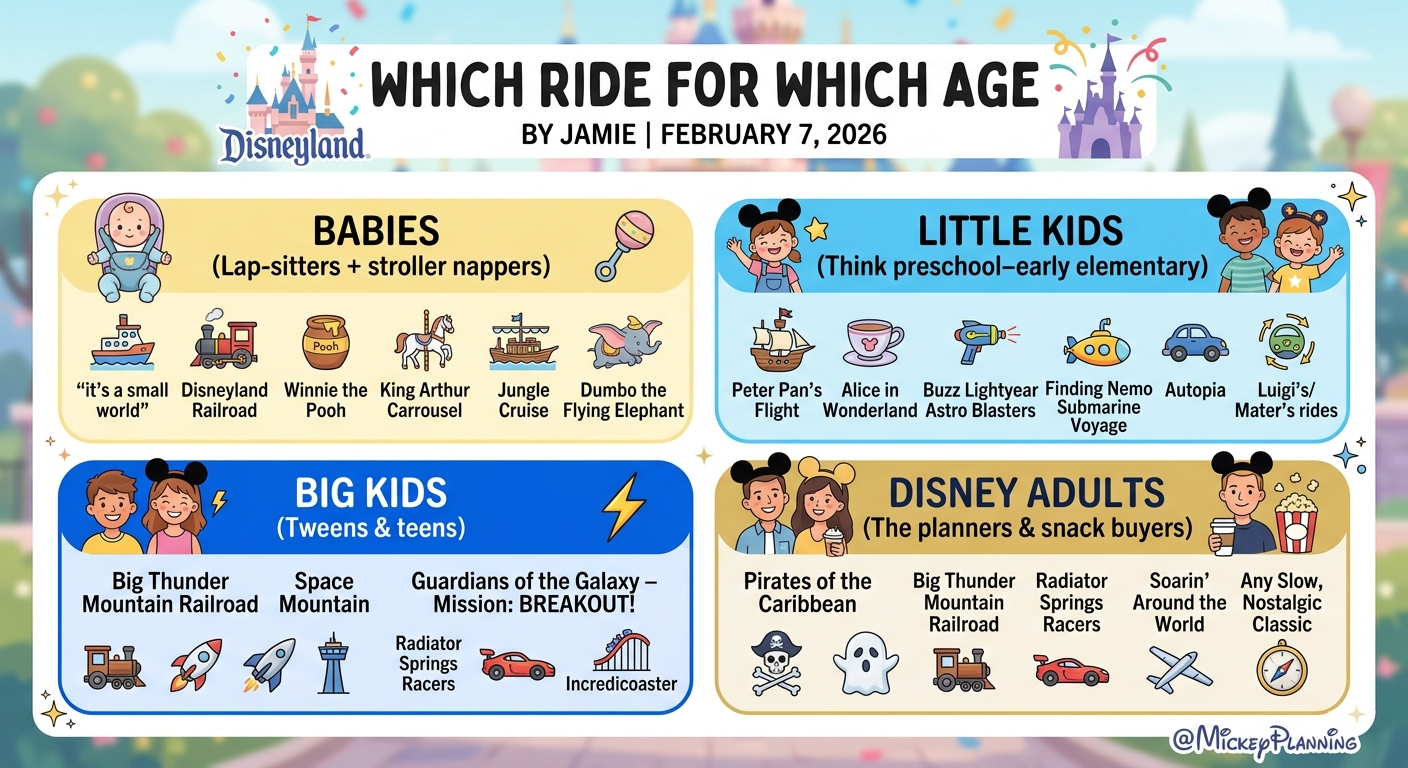 Here’s our family’s must-do rides by age—Babies, Little Kids, Big Kids, and Disney Adults—plus quick notes so you can decide what fits your crew.